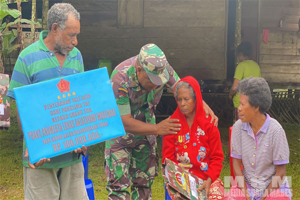 MediaSuaraMabes, Yapen – Berlokasi di Kampung Waniwon Distrik Yawakukat Kabupaten Kepulauan Yapen, Mayor Inf Luter Ayomi Pabung Kabupaten Waropen Kodim 1709/Yawa menyerahkan bantuan Tali asih dari Panglima TNI kepada Orang tua dari Almarhum Praka Anumerta Lukas Anjatayawi Worembai yang telah gugur dalam melaksanakan tugas di Kabupaten Yahukimo, Senin (06/03/2023).