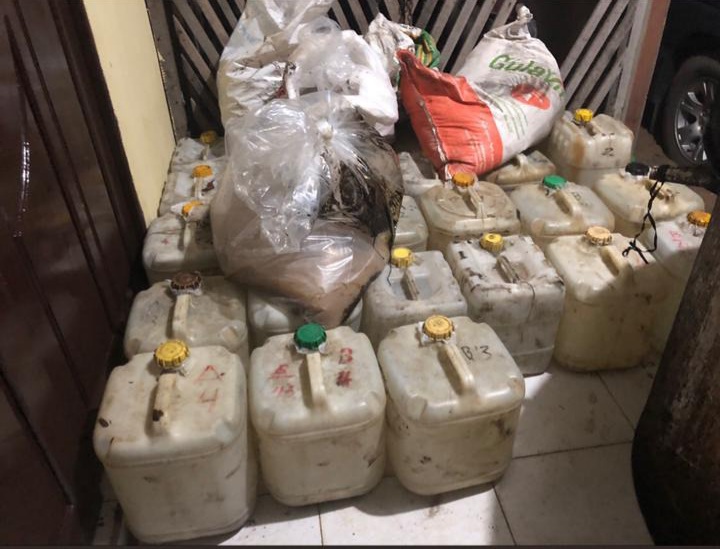 Dari lokasi pertama, Satuan Reskrim Polres Ketapang menggrebeg sebuah rumah milik tersangka seorang laki laki berinisial HKL ( 64 Tahun ) dan mengamankan sejumlah barang bukti berupa 90 ( sembilan puluh ) kantong tuak dengan ukuran 90 liter perkantong, 12 ( dua belas ) jerigen miras jenis arak dan 3 ( tiga ) buah dandang dengan ukuran 180 liter, turut juga diamankan seorang tersangka lainnya laki laki berinisial DS ( 24 Tahun ) yang merupakan karyawan dari tersangka HKL.