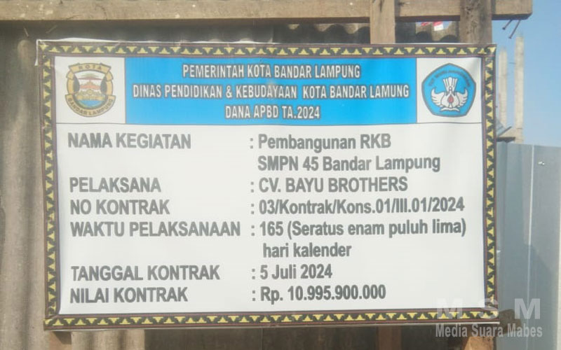 MediaSuaraMabes, Bandar Lampung – Pelaksana pekerjaan pembangunan Ruang Kelas Baru (RKB) SMPN 45 Bandar Lampung yang dikerjakan oleh Kontraktor CV. Bayu Brothers tersebut dinilai tidak mematuhi K3 dan mengabaikan keselamatan Pekerja. Hal tersebut ditemukan saat Awak Media, yang tergabung sebagai Patners Forum Pers Independent Indonesia (FPII) Prov. Lampung melakukan investigasi di lapangan senin, (23-09-2024).