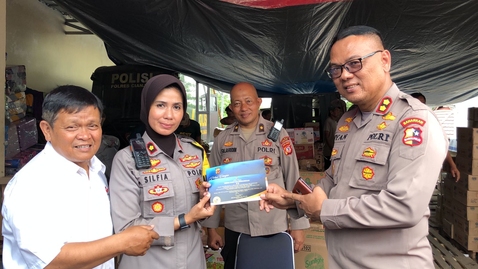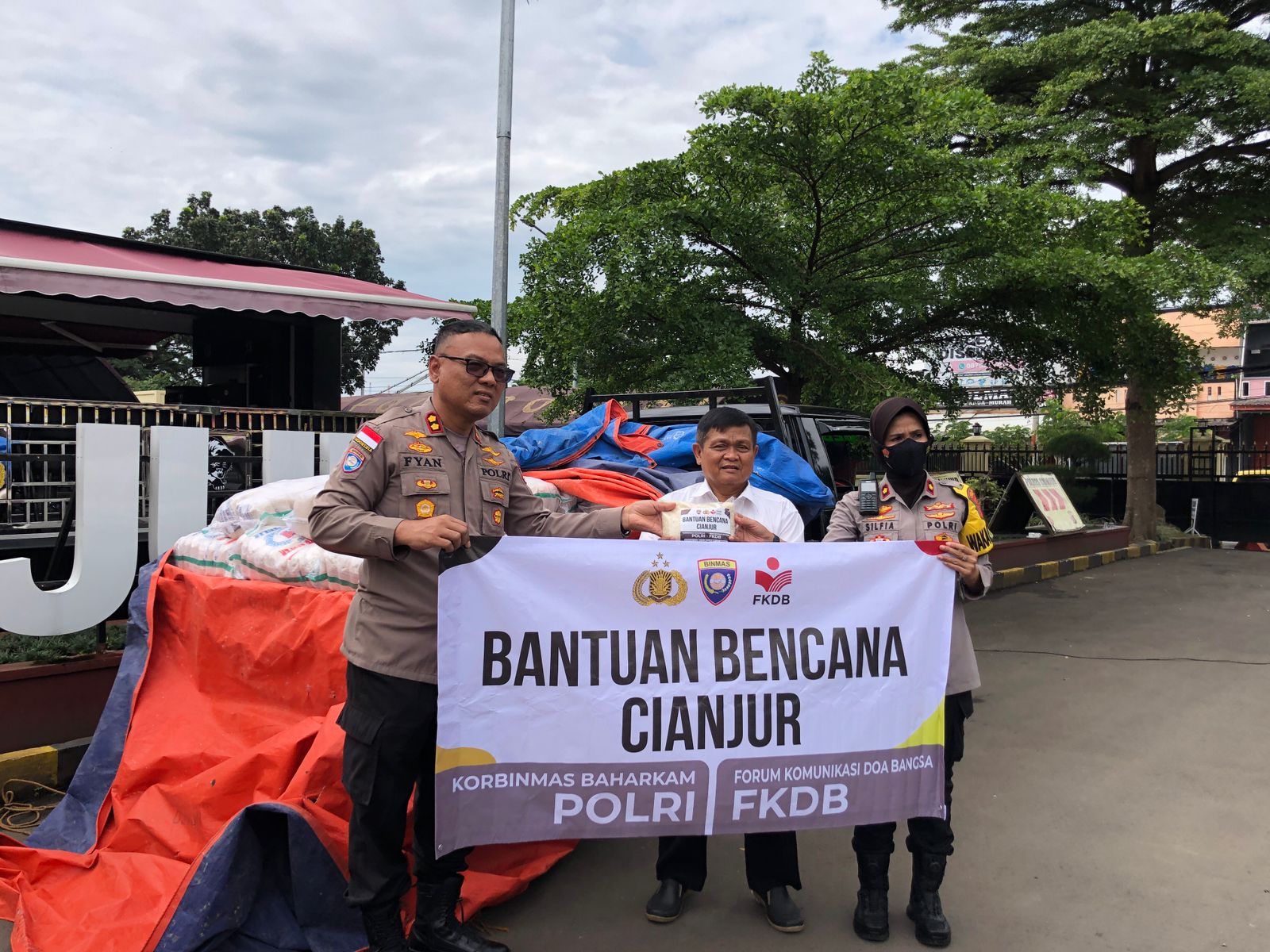 Korbinmas Baharkam Polri yang diwakili oleh AKBP Sofyan Budiono, S.H., M.Si. selaku Kasibinorsosmas Subditbinpolmas Ditbintibmas didampingi Pengurus FKDB menyerahkan bantuan berbentuk sembako berupa 1,5 Ton beras tersebut ke Posko Polres Cianjur dan diterima oleh Wakapolres Cianjur-Kompol Silfia Sukma Rosa, S.H., S.I.K.