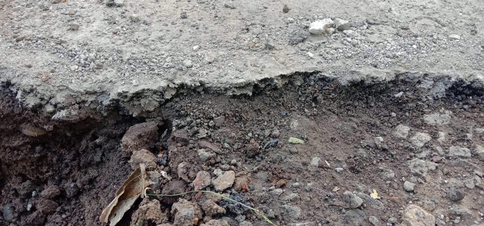 Aspal yang terkelupas jika dilihat langsung, terlihat tanah seolah-olah tanpa ada tahapan pondasi atau stripping pemadatan juga lapisan pondasi bawah.