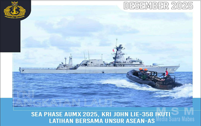 MediaSuaraMabes, Jakarta – Tahap Sea Phase ASEAN–U.S. Maritime Exercise (AUMX) 2025 berlanjut pada hari kedua dengan pelaksanaan latihan laut multinasional di Perairan Timur Bintan, Sabtu 13 Desember 2025. Unsur kapal perang dari negara-negara ASEAN bersama Amerika Serikat kembali melaksanakan berbagai skenario latihan bersama, termasuk kapal perang TNI AL yaitu KRI John Lie (JOL)-358 dari Satuan Kapal Eskorta (Satkor) Koarmada I.