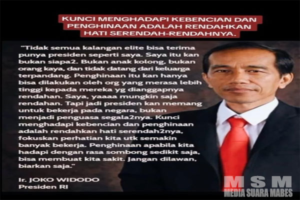 Gaya Kepemimpinan Presiden Jokowi yang Rendah Hati dan Sederhana, Jujur, Tulus dan Ikhlas, Tekun dan Kerja Keras, Kreatif dan Inovatif. Gaya Kepemimpinan Presiden Jokowi yang suka Mendengar, Melihat, Blusukan dan Peduli, cerdas dan bijak, Tegas dalam Keputusan, Santun dan Menghormati Orang lain, yang Tegar Dikritik, Dihina, Direndahkan dan memaafkan, Mendidik, Memotivasi dan Menginspirasi dan masih banyak lagi gaya kepemimpinan dia yang layak dan patut ditiru dan diteladani oleh semua komponen bangsa. (Ring-o)