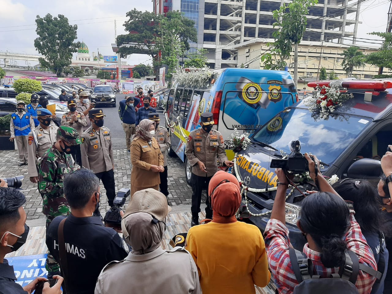 SuaraMabes, Palembang – Kapolda Sumsel Irjen Pol Prof Dr Eko Indra Heri S MM meresmikan Mobile Vaksinasi Covid 19 Rumah sakit Bhayangkara Polda Sumsel dan pemberian Paket Lebaran. Dihadiri Wakapolda Sumsel Brigjen Pol Rudi Setiawan Sik SH MH Kadinkes Prov Sumsel Dra Lesty Nurainy Apt,M.Kes.Karumkit Bhayangkara Polda Sumsel AKBP Dr wahono, Karumkit AK Gani Kolonel Ckm dr.Ponco Darmono dan PJU Polda Sumsel di halaman gedung Promoter, Senin (26/04/2021).
