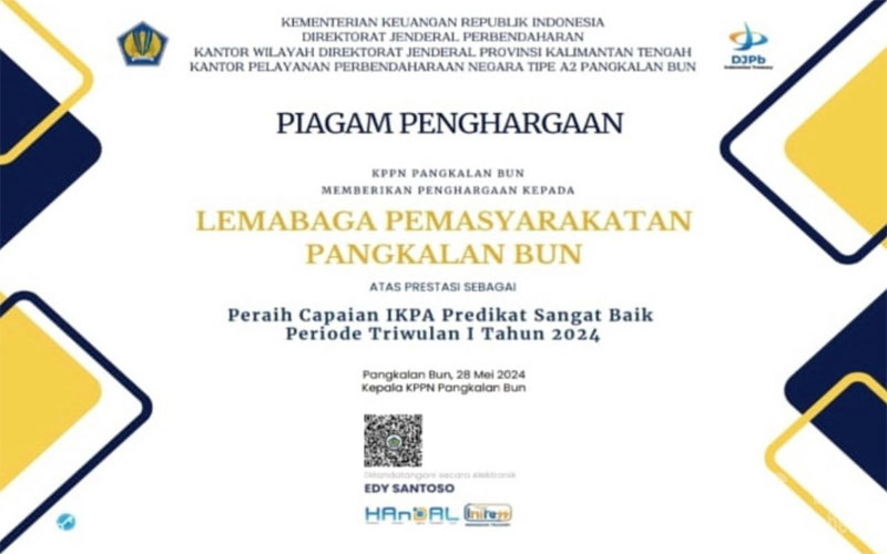 Sebelumnya pada triwulan I 2024 Lapas Pangkalan Bun mendapatkan Penghargaan dari Kantor Pelayanan Perbendaharaan Negara Kotawaringin Barat atas prestasi capaian IKPA Predikat Sangat Baik.