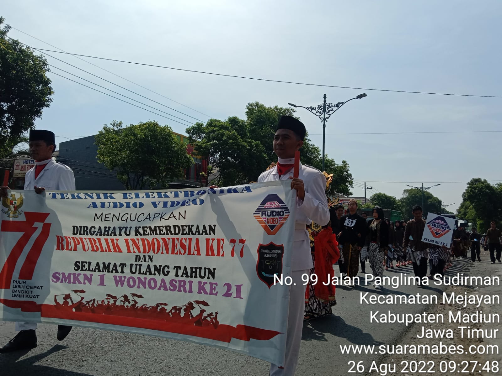 MediaSuaraMabes, Madiun – Memanfaatkan momen Hari Ulang Tahun ke 21, SMKN 1 Wonoasri mengadakan kegiatan Kirab Budaya untuk menghargai budaya kearifan lokal. Kegiatan ini ikuti oleh seluruh siswa serta pengajar dan staff SMKN Wonoasri.