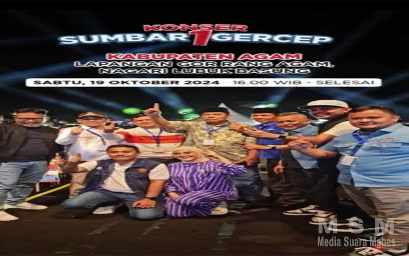 MediaSuaraMabes, Agam – Puluhan ribu massa memadati Lapangan Rang Agam, Lubuk Basung, Sabtu (19/10/2024), dalam Konser Sumbar 1 Gercep yang digelar pasangan calon Gubernur dan Wakil Gubernur Sumatera Barat nomor urut 1, Mahyeldi-Vasko. Konser ini merupakan yang kedua setelah Pasaman dan mendapat sambutan luar biasa dari masyarakat Agam.