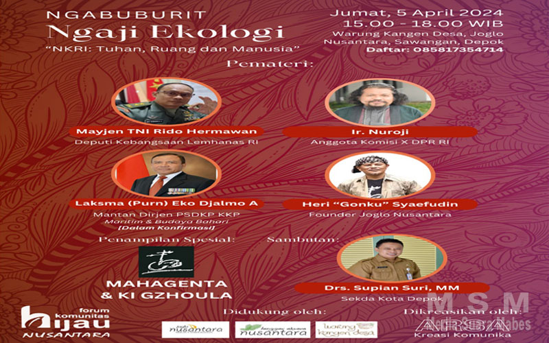 MediaSuaraMabes, Depok – Dalam rangka melestarikan lingkungan dan budaya di wilayah kota Depok Jawa Barat forum komunitas Hijau Nusantara adakan acara Ngabuburit Ngaji ekologi dengan tema : Tuhan Ruang dan Manusia pada hari Jum’at (5/4/2024) bertempat di warung kangen desa Joglo Nusantara Sawangan kota Depok Jawa Barat.