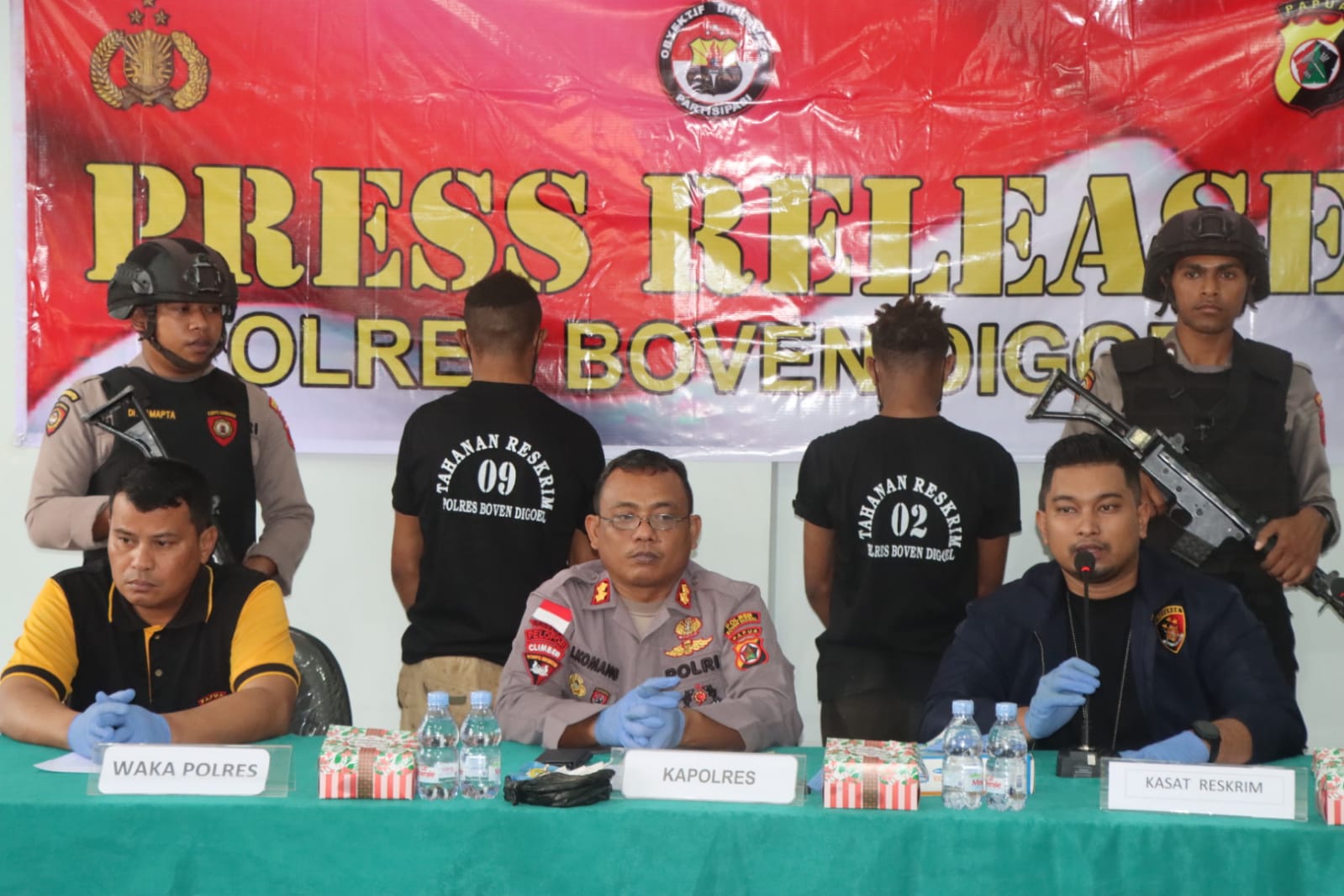 MediaSuaraMabes, Boven Digoel -Komitmen penanganan Tindak pidana Pencurian Kapolres AKBP I Komang Budiartha, SIK gelar Press Release pengungkapan kasus pencurian dan kasus narkoba jenis ganja bertempat di aula Polres Boven Digoel hari Jumat tanggal (05/08)22).