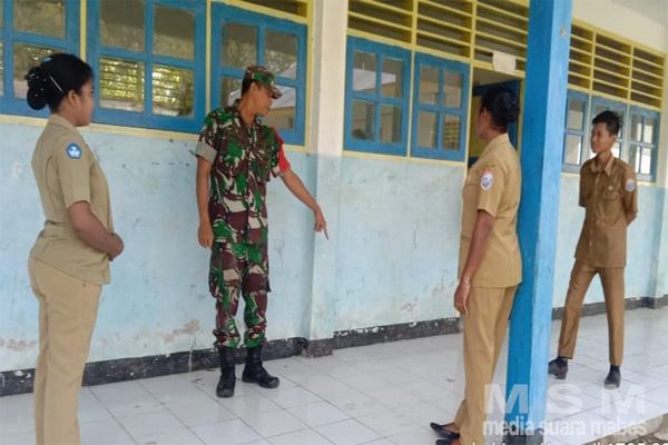 Dalam kegiatan Babinsa Koramil 1705-02/Napan Sertu A. Junaidi menyampaikan kedatangan kami kesini juga untuk menjalin silaturahmi kepada Kepala sekolah dan guru SDN Inpres, di sela – sela kegiatan Babinsa menyempatkan waktu memantau proses belajar mengajar para Siswa – siswi SDN Inpres Kampung Waenami.