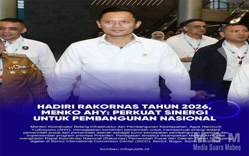 MediaSuaraMabes, Bogor — Menteri Koordinator Bidang Infrastruktur dan Pembangunan Kewilayahan, Agus Harimurti Yudhoyono (AHY), menegaskan komitmen pemerintah memperkuat sinergi antara pemerintah pusat dan pemerintah daerah sebagai kunci percepatan pembangunan nasional serta implementasi program prioritas Presiden. Penegasan itu disampaikan AHY saat menghadiri Rapat Koordinasi Nasional (Rakornas) Pemerintah Pusat dan Daerah Tahun 2026 di Sentul International Convention Center (SICC), Sentul, Kabupaten Bogor, Jawa Barat, Senin (2/2/2026).