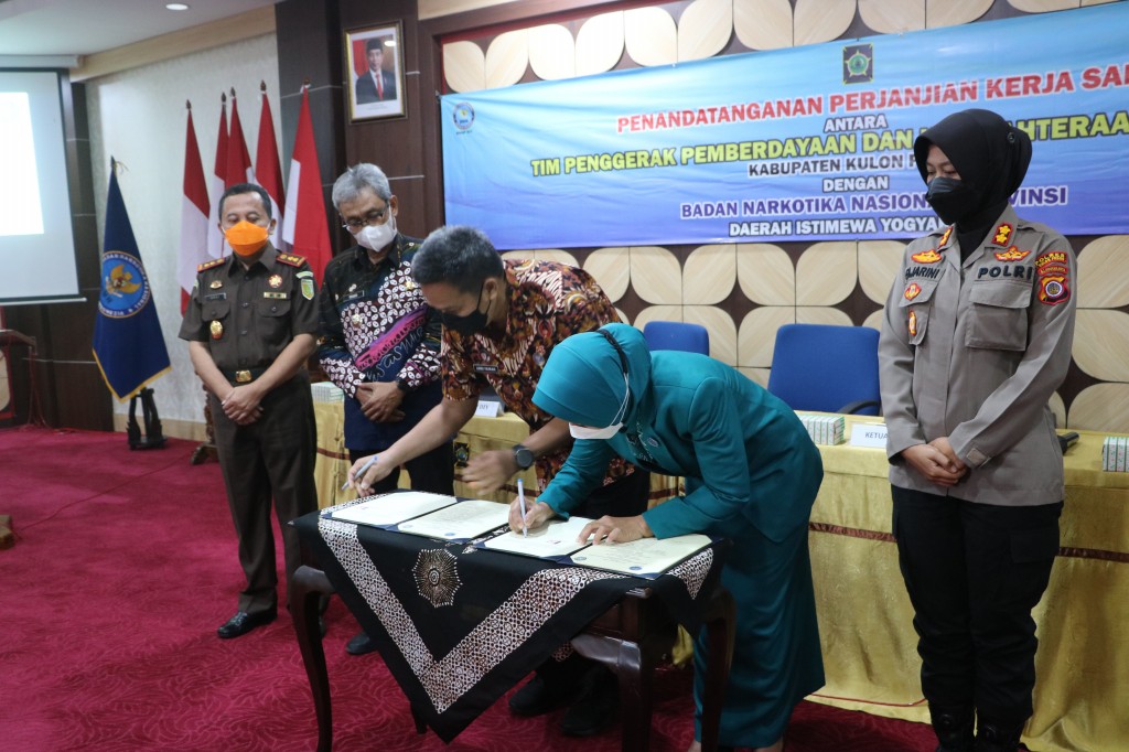 MediaSuaraMabes, Yogyakarta – Menekan penyalahgunaan Narkoba, Tim penggerak (TP) PKK Kabupaten Kulon Progo besama Badan Narkotika Nasional Propinsi (BNNP) DIY tandatangani Memorandum of Understanding (MoU) untuk bersama -sama memerangi narkoba .Hal tersebut sebagai bentuk kerjasama guna memproteksi keluarga dari ancaman Narkoba. Berlangsung di ruang Sermo, kompleks Pemkab Kulon Progo. Kamis (11/8)