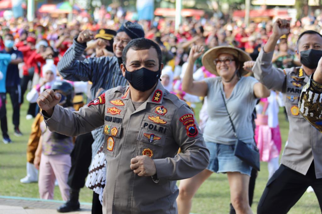 Kapolda Jateng Irjen Pol Ahmad Luthfi bersama Forkompinda Magelang dan tokoh masyarakat Magelang, KH Yusuf Chudhori (pengasuh ponpes API) yang turut hadir dalam kegiatan itu, turut mengikuti gerak tari yang melambangkan semangat gotong royong dan kebersamaan tersebut.