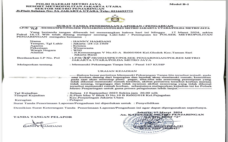 Atas kejadian itu, sang Nenek pun melaporkan balik 4 orang tersebut atas dugaan tidak menyenangkan, dengan isi laporan telah meresahkan dirinya dengan aksi membuat gaduh atau teriak di tengah malam dan masuk pekarangan tanpa izin. Berdasarkan Laporan dengan no LP/B/368/III/2024/SPKT/Polsek penjaringan/polres metro Jakarta Utara/Polda metro jaya belum juga ada tindakan hasil penyidikan.