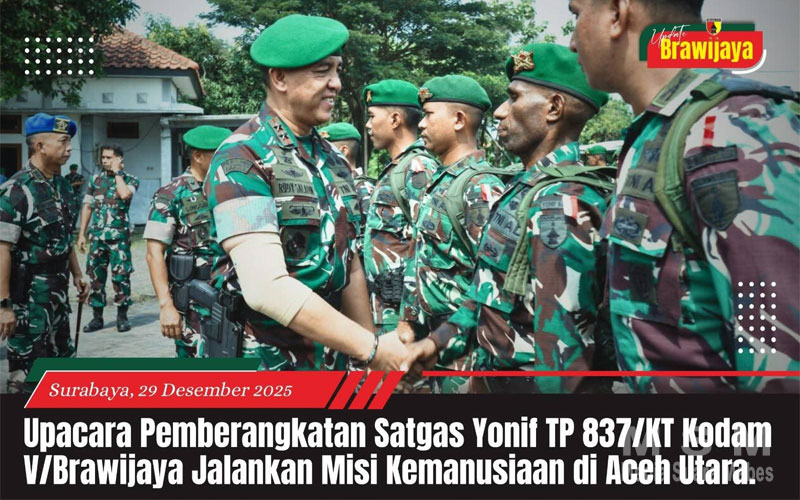 MediaSuaraMabes, Surabaya – Sebanyak 200 prajurit Yonif TP 837/KT Kodam V/Brawijaya secara resmi diberangkatkan untuk melaksanakan misi kemanusiaan di Aceh Utara, dalam rangka membantu penanggulangan bencana alam yang melanda wilayah tersebut.