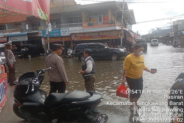 Ketinggian air akibat curah hujan yang tinggi di Daerah Hukum Polsek Singkawang Barat bervariasi sekira 5 sampai 10 Cm kecuali di perumahan yang berdekatan dengan bataran sungai ketinggian air satu pinggang orang dewasa dan Cenderung Surut dan hingga sekarang ini belum ada dampak Pengungsian namun pak Darmin selaku ketua RT bersama Bhabinkamtibmas , Babinsa lagi mendatakan warga yang mungkin akan mengungsi , untuk di sepanjang jalan Tani banyak lobang – lobang yang tertutup oleh Air dan perlu pemberian tanda agar tidak membahayakan pengguna jalan yang melaluinya.