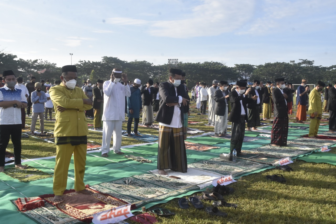 MediaSuaraMabes, Gorontalo – Bupati Gorontalo Nelson Pomalingo didampingi Ketua Tim Penggerak PKK Dr. Fory Naway melaksanakan sholat idul adha 1442 H di lapangan Sport Center Limboto Kabupaten Gorontalo, selsa, (20/7/2021).