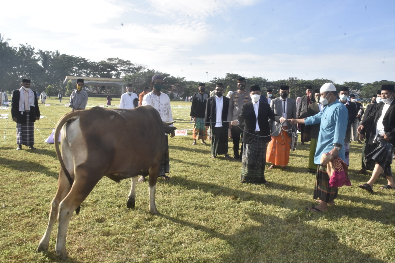 Bupati Nelson Pomalingo pada acara idul adha 1442 Hijriah menyerahkan hewan kurban berupa satu ekor sapi kepada petugas kebersihan. Penyerahan satu ekor sapi kurban tersebut diterima langsung koordinator Petugas kebersihan, seusai pelaksanaan Sholat Idul Adha di Lapangan Sport Center Limboto, Selasa, (20/7/2021).