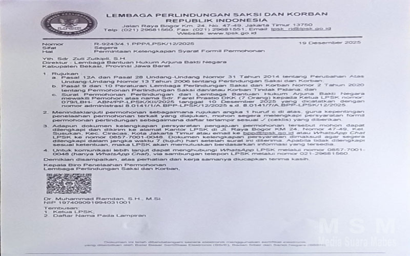 Hal tersebut tertuang dalam surat resmi LPSK tertanggal 19 Desember 2025 dengan nomor R-9243/4.1.PPP/LPSK/12/2025, yang ditujukan kepada Zuli Zulkipli, S.H, selaku Direktur LBH Arjuna Bakti Negara Kabupaten Bekasi, Jawa Barat.