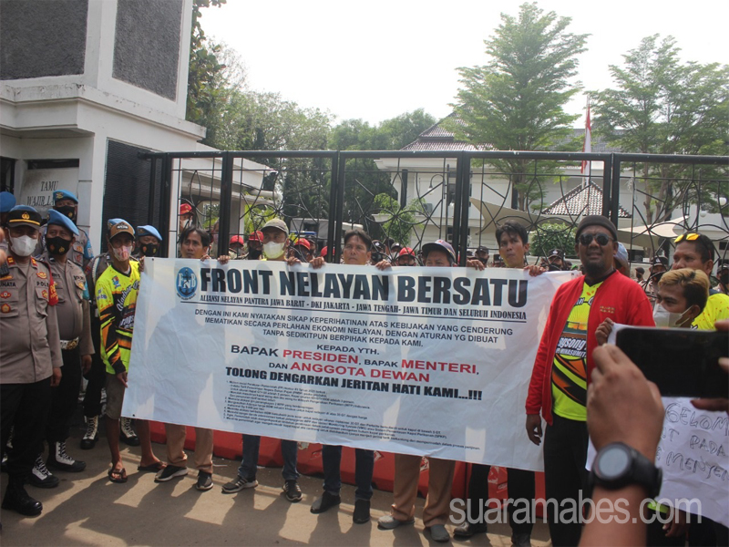 MediaSuaraMabes, Indramayu – Ribuan massa unjuk rasa dari berbagai wilayah yang tergabung dalam Front Nelayan Bersatu menyuarakan aksi keprihatinan kebijakan peraturan pemerintah terhadap nelayan, mereka mendatangi kantor DPRD Indramayu meminta wakil rakyat menyampaikan aspirasinya kepada pemerintah pusat untuk merevisi peraturan pemerintah dan menyampaikan permasalahan yang berdampak terhadap perekonomian nelayan Jawa barat, Jawa Tengah, Jawa Timur, dan DKI Jakarta bahkan hampir di seluruh Indonesia khususnya di wilayah pantura.Aksi keprihatinan Front Nelayan Bersatu (FNB) digedung DPRD berlangsung Damai tertib dan Aman dengan pengawalan ketat dari pihak keamanan, kepolisian, Anggota kodim dan Anggota satuan polisi pamong praja.
