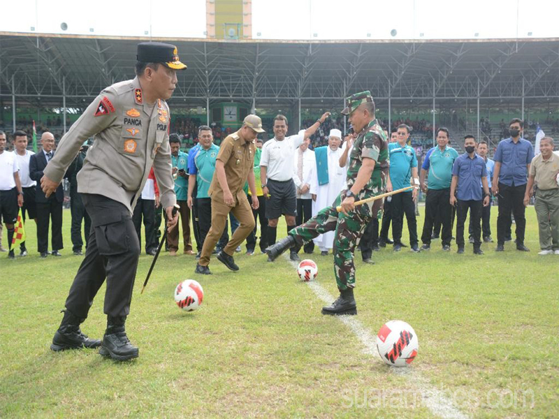 MediaSuaraMabes, Medan – Pangdam I/BB, Mayjen TNI Achmad Daniel Chardin, SE, MSi, bersama Kapoldasu, Irjen Pol RZ Panca Putra Simanjuntak, MSi, dan unsur Forkopimda Sumut lainnya melakukan kick off turnamen sepak bola Piala Kasad Liga Santri PSSI Tahun 2022 Wilayah Kota Medan bertempat di Stadion Teladan Medan, Senin (20/6/2022) sore.