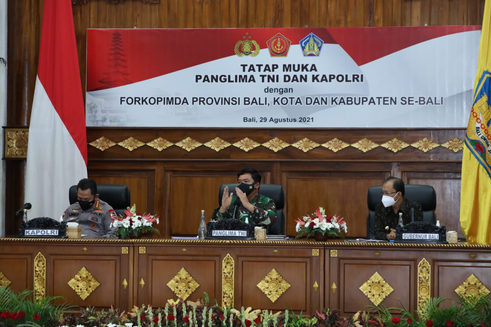 SuaraMabes, Bali – Panglima TNI Marsekal TNI Hadi Tjahjanto, S.I.P., bersama Kapolri Jenderal Pol Drs. Listyo Sigit Prabowo, M.Si, memimpin diskusi terkait penanganan Covid-19 dan tatap muka bersama Forkopimda Provinsi Bali dan Kabupaten Se-Bali, bertempat di Kantor Gubernur Bali, Minggu (29/8/2021).