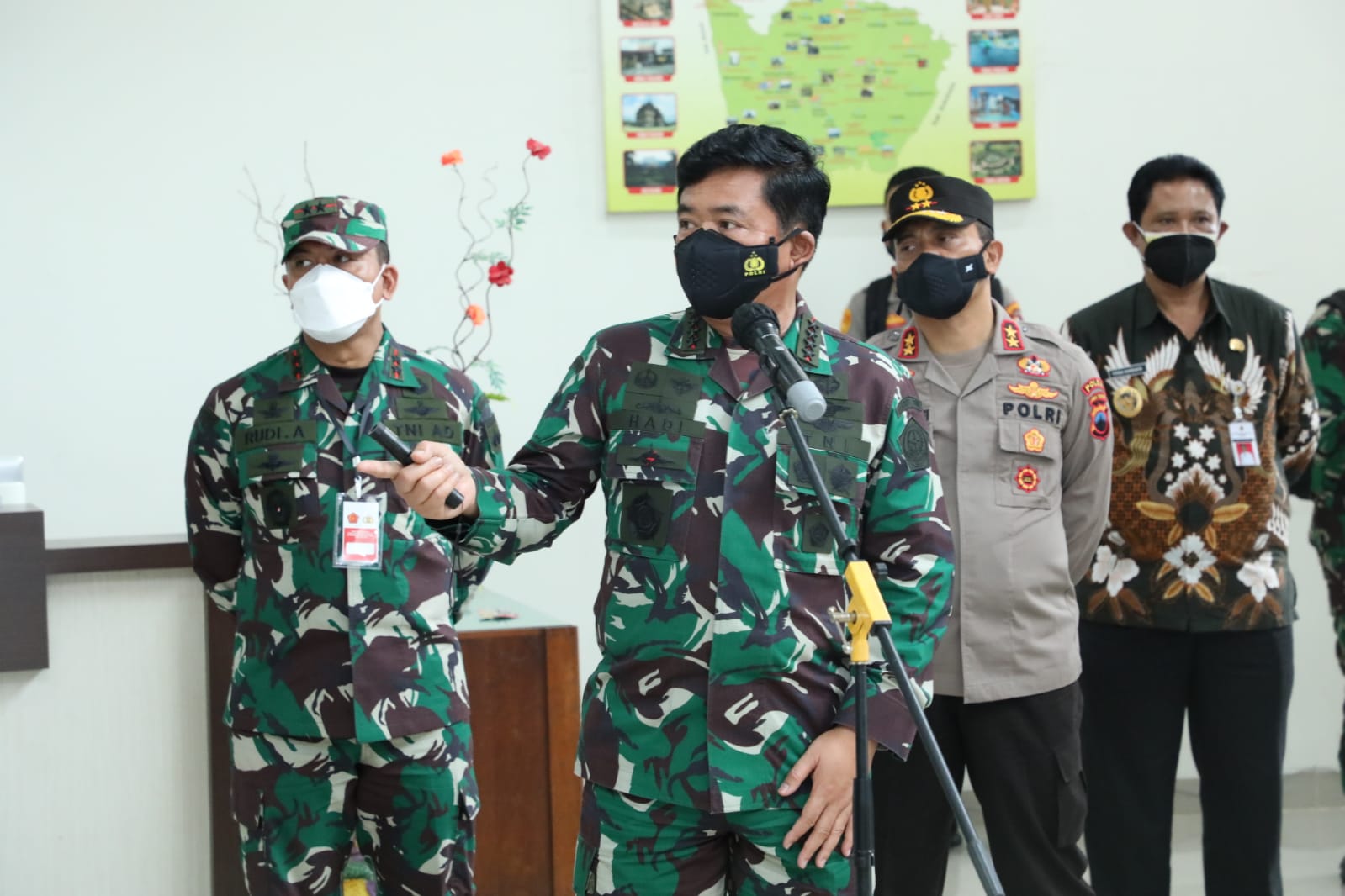 Hal tersebut disampaikan Panglima TNI Marsekal TNI Hadi Tjahjanto, S.I.P saat memimpin rapat terkait penanganan Covid-19 yang didampingi Menteri Kesehatan Ir. Budi Gunadi Sadikin, CHFC, CLU., Kapolri Jenderal Pol Drs. Listyo Sigit Prabowo, M.Si., dan Forkompimda Kabupaten Klaten, bertempat di Aula kantor Bupati Klaten, Sabtu (21/8/2021).
