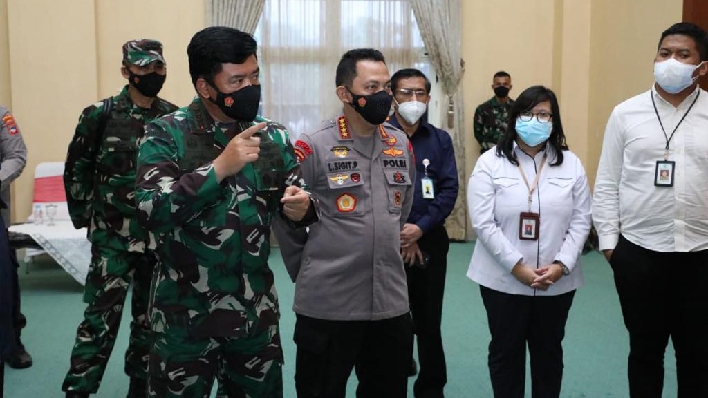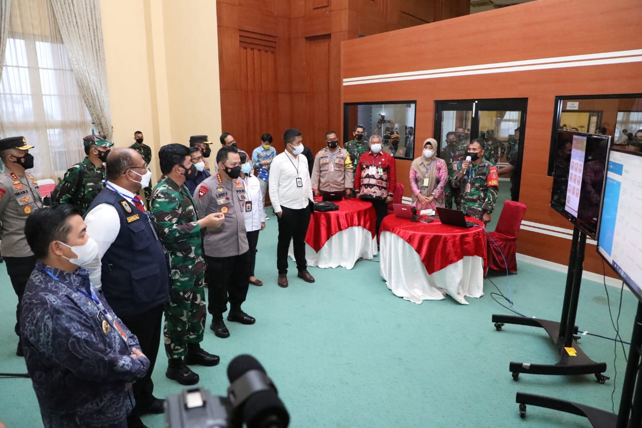Setelah memimpin rapat dengan Forkopimda, Panglima TNI bersama Kapolri mengecek dan melihat secara langsung kesiapan petugas yang menggunakan Aplikasi Silacak.
