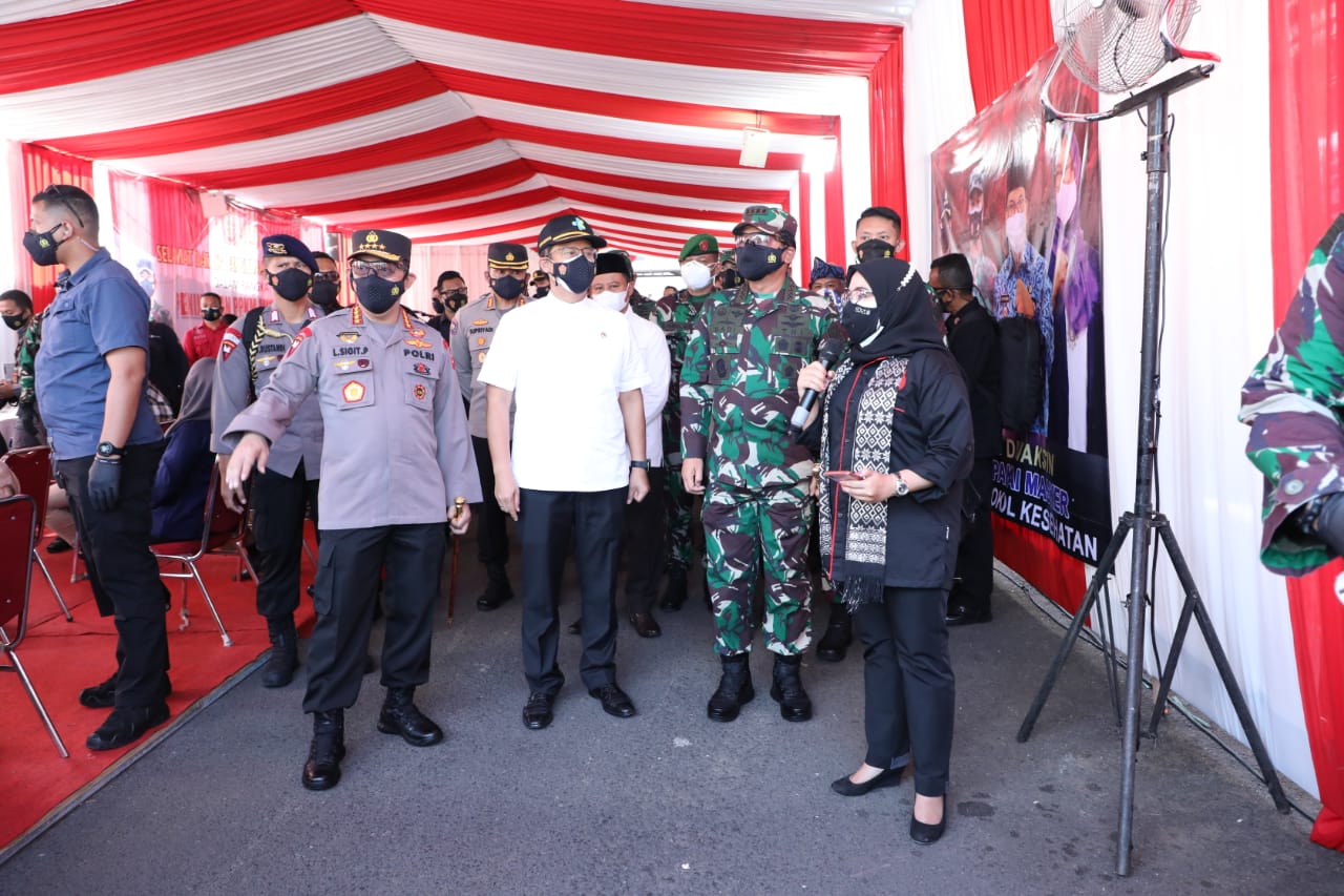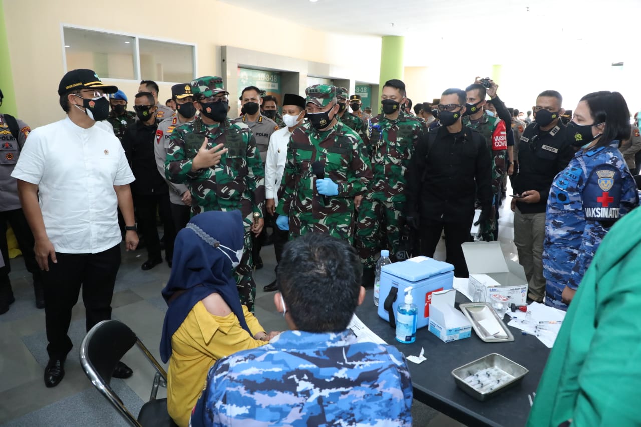 SuaraMabes, Bandung – Panglima TNI Marsekal TNI Hadi Tjahjanto, S.I.P., bersama Menkes RI Ir. Budi Gunadi Sadikin, CHFC, CLU., Kapolri Jenderal Pol Drs. Listyo Sigit Prabowo, M.Si. dan Kepala BNPB Letjen TNI Ganip Warsito, S.E., M.M., melaksanakan peninjauan sentra Vaksinasi di Gor Arcamanik dan Posko Pemberlakuan Pembatasan Kegiatan Masyarakat (PPKM) Taman Sari, Bandung, Jawa Barat, Kamis (8/7/2021).
