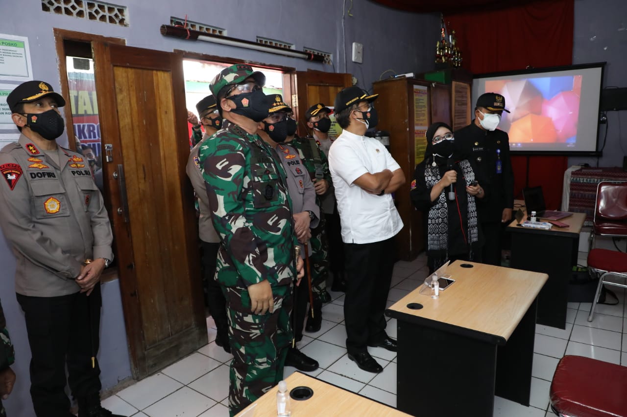 Sementara saat meninjau Posko PPKM wilayah Taman Sari, Panglima TNI dan rombongan mengecek peta zonasi wilayah yang dikategorikan dan kesiapan aparat Empat Pilar yang bertugas, serta menerima penjelasan secara rinci dari Ibu Nina Fitriana salah satu petugas PPKM tentang prosedur yang telah disiapkan di daerah tersebut, antara lain pelacakan kontak erat, pengawasan ketat isolasi mandiri, menutup tempat umum, melarang kerumunan, membatasi keluar masuk masyarakat dan pecatatan recording situasi dan keadaan di masyarakat.