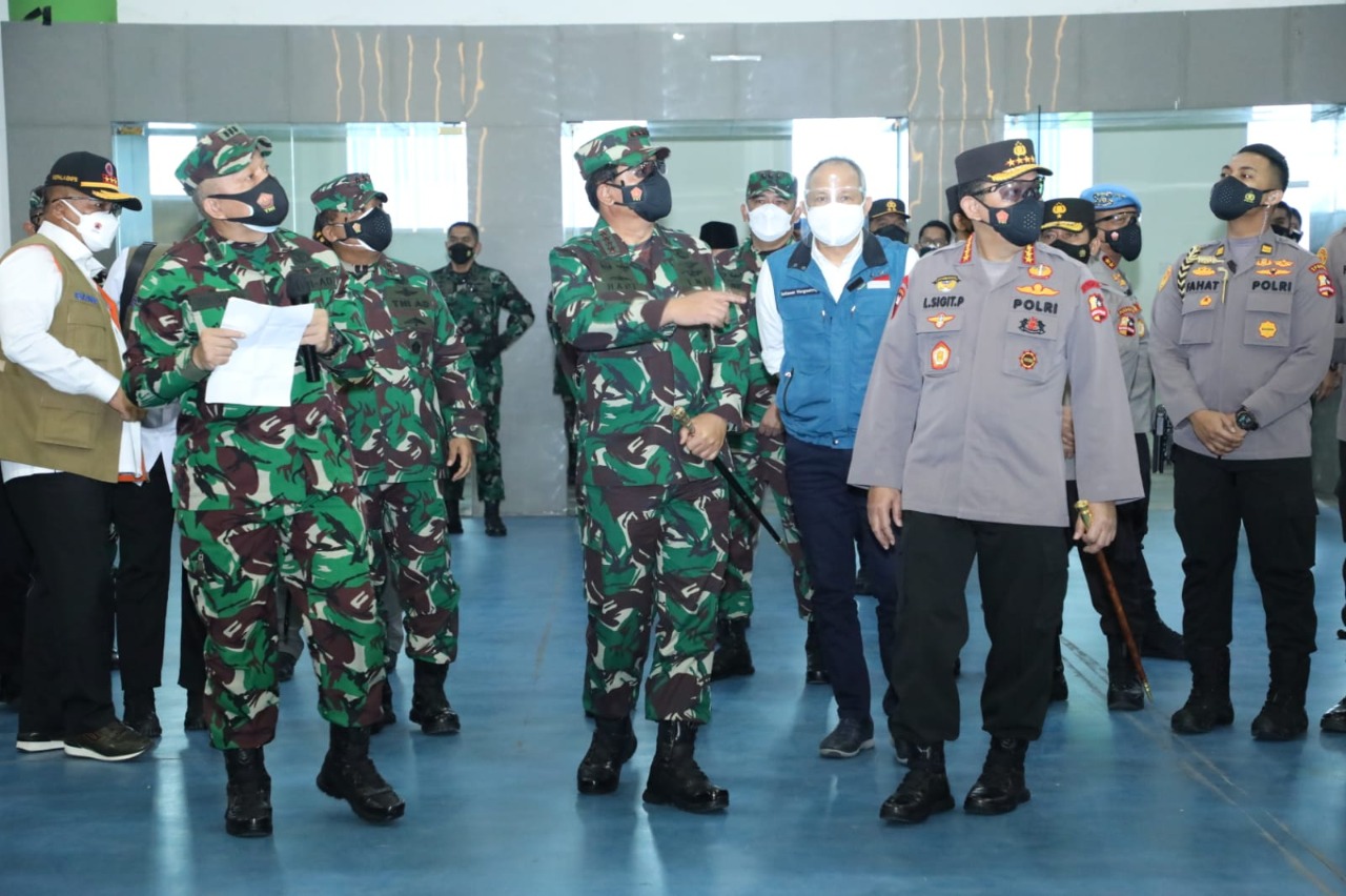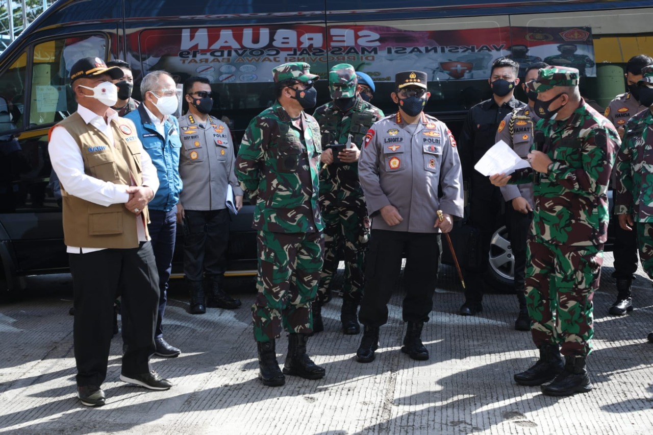 SuaraMabes, Bandung – Panglima TNI Marsekal TNI Hadi Tjahjanto, S.I.P., bersama Kapolri Jenderal Pol Drs. Listyo Sigit Prabowo, M.Si. dan Kepala BNPB Letjen TNI Ganip Warsito, S.E., M.M., melaksanakan peninjauan sentra Vaksinasi di GOR Arcamanik dan Pemberlakuan Pembatasan Kegiatan Masyarakat (PPKM) Darurat ditengah-tengah masyarakat di Kelurahan Turangga Karawitan No 83 Gg. Damka Dalalin, Bandung, Jawa Barat, Jumat (16/7/2021).
