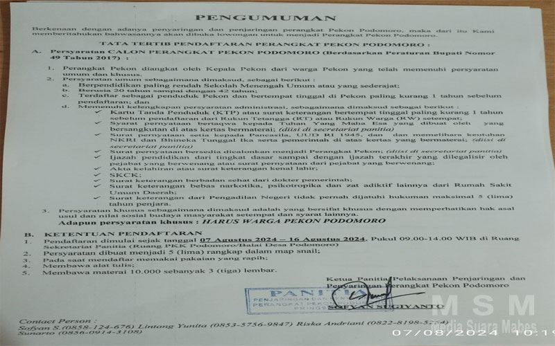 MediaSuaraMabes, Pringsewu – Panitia Penjaringan Perangkat Pekon Podomoro, membuka pendaftaran terkait perangkat Pekon, Jum’at, 9/8/2024.