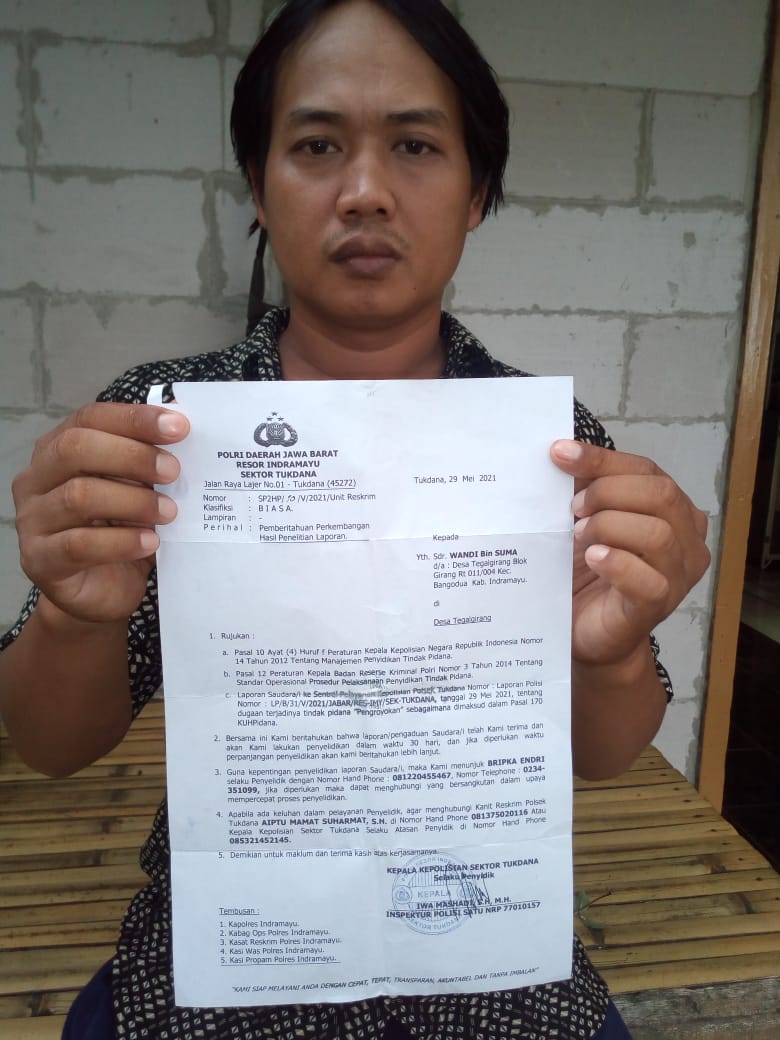 Berdasarkan Surat Tanda Penerima Laporan Polisi Nomor STPLP/3/V/2021/Unit Reskrim. Kinerja jajaran satuan Reserse Kriminal (Reskrim) Tukdana tidak bisa diinterfensi oleh siapa pun kerja Reskrik berdasarkan aturan,sebagai bukti keseriusan Reskrim polsek Tukdana telah melakukan pangilan para saksi dan telah mengeluarkan Surat Nomor SP2HP 30/V/2021/ Unit Reskrim (Pemberitahuan Perkembangan Hasil Penelitian Laporan) Tanggal 29 Mei 2021 dengan tembusan Kapolres Indramayu, Kabag Ops Polres Indramayu, KasatReskrim Polres Indramayu, Kasi Was Polres Indramayu dan Kasi Propam Polres Indramayu.