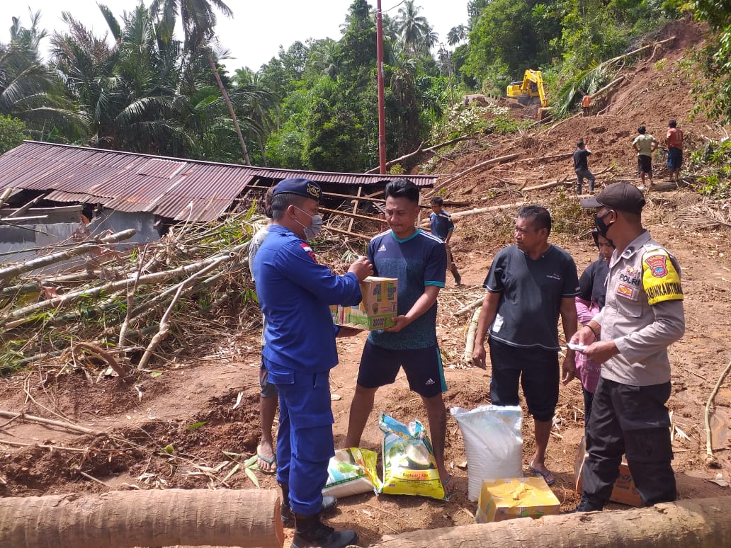 MediaSuaraMabes, Sangihe — Guna mengurangi beban masyarakat yang menjadi korban banjir dan longsor di wilayah desa Petta Selatan Kampung Embuhanga dan Lepe Kecamatan Tabukan Utara Kabupaten Sangihe, Bhabinkamtibmas Aipda Jumli Lintuhaseng membagikan sembako kepada warga masyarakat yang tempat tinggalnya tertimbang longsor. (6/1/2022)