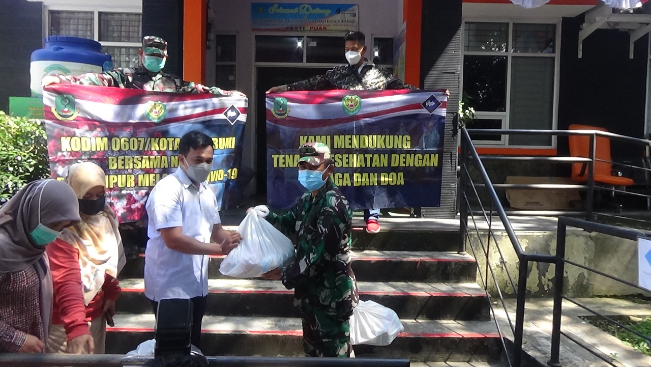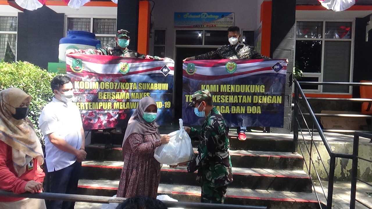 Kepala Staf Kodim 0607/Kota Sukabumi Mayor Chb R. Khoirullah mewakili Dandim menyerahkan bantuan sembako kepada tenaga kesehatan di RSUD Al-MULK yang diterima langsung oleh Direktur RSUD Al-MULK, dr Munifah.