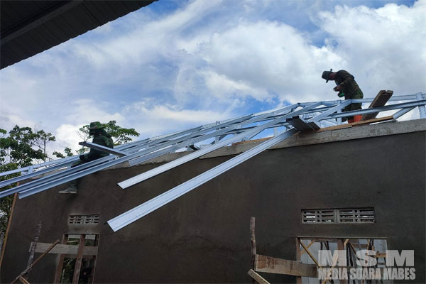 MediaSuaraMabes, Singkawang – Sasaran fisik program TMMD imbangan ke– 117 sudah mulai memasang rangka atap.Terlihat dalam gambar anggota Satgas TNI Manunggal Membangun Desa (TMMD) ke-117 Kodim 1202/Skw sedang melakukan pemasangan rangka atap dari baja ringan di Jl.Mantoman,Rt.07,Kel. Nyarumkop,Kec.Singkawang timur. Minggu (30/06/2021).