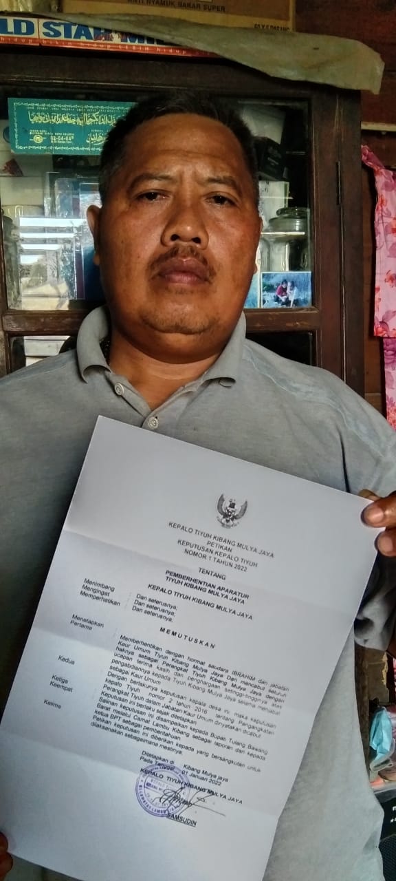 Lanjut Ibrahim “yang menjadi pertanyaan saya selama ini apa kesalahan saya, dan keanapa surat permberhentian saya terbit nya tanggal 01/01/2022, sedangkan saya terima surat nya tanggal 17/01/2022. kenapa surat nya tidak di sampaikan sebelum rapat, pemperhentian dan pengakatan perangkat tiyuh, sudah pasti saat rapat akan saya bahas supaya jelas di mana kesalahan dan kekurangan persyaratan saya, apa lagi salma saya mengabdi saya tidak pernah mendapatkan Surat Peringatan (SP).”