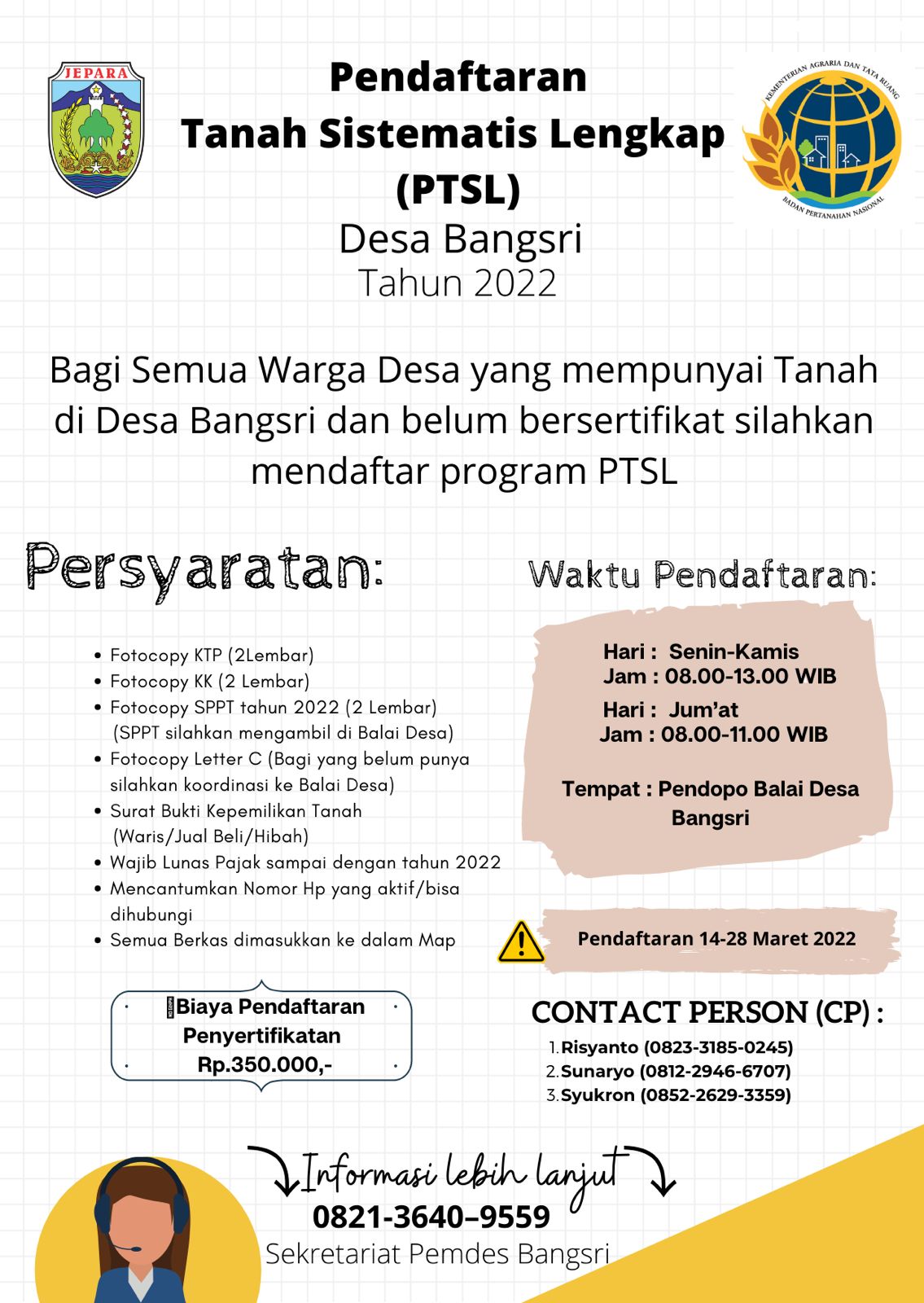 MediaSuaraMabes, Jepara – Pemerintah Desa Bangsri kecamatan Bangsri kabupaten Jepara Provinsi Jawa tengah, sudah membuka pendaftaran pembuatan Sertifikat Hak Milik (SHM). Bagi warga masyarakat yang mempunyai tanah di Desa Bangsri dan belum bersertifikat silahkan mendaftarkan tanahnya melalui program Pendaftaran Tanah Sistematis Lengkap (PTSL) di tahun 2022 ini. Hal itu disampaikan oleh Petinggi Desa Bangsri H. Sunaryo, pada awak media di ruang kerjanya. Jum’at, 11/3/2022.