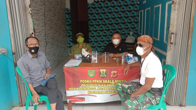 MediaSuaraMabes, Sukabumi – Pemerintah Desa (Pemdes) Kadununggal, Kecamatan Kalapanunggal, Kabupaten Sukabumi, melaksanakan Pemberlakuan Pembatasan Kegiatan Masyarakat (PPKM) skala mikro dalam upaya untuk memutus rantai penyebaran Covid-19, semakin merebak, Kamis (01/07/2021).