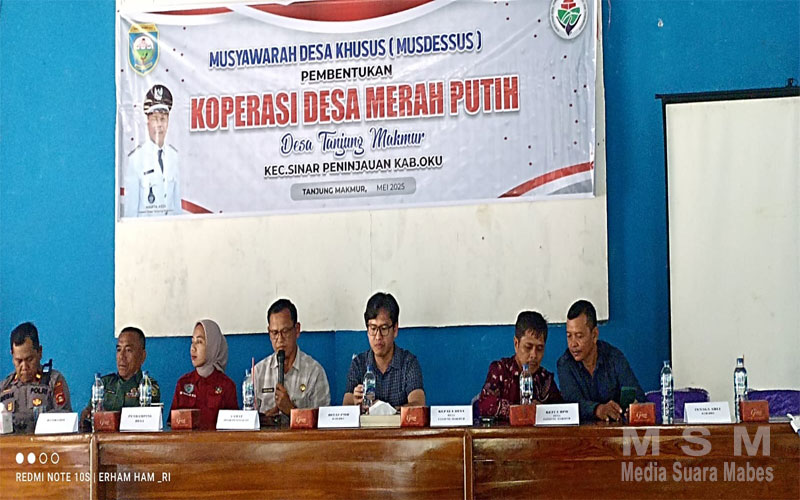 MediaSuaraMabes, Baturaja OKU Sumsel – Musyawarah Desa Khusus Pembentukan koperasi merah putih Desa Tanjung Makmur kecamatan sinar peninjauan kegiatan ini berlangsung di gedung sebaguna Tanjung makmur Pimpinan Musyawarah di Pimpin Oleh BPD Desa . Jum’at 23 Mei 2025 yang di hadiri oleh kepala Desa,bapak Marta asdi bapak camat . Bapak kapolsek Sinar peninjauan ,Danramil ,kabid PMD , pendaping Desa, serta pengurus koprasi kabupaten , Perangkat Desa, Ketua dan anggota BPD, ketua RT/RW, kader posyandu,