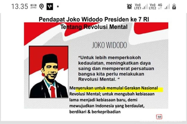 Disisi lain Presiden Jokowi berpendapat tentang Revolusi mental: Untuk memperkokoh, Kedaulayan, Meningkatkan daya saing dan mempererat persatuan bangsa, kita perlu melakukan revolusi mental, Menyerukan untuk memulai Gerakan nasional revolusi mental untuk mengubah kebiasaan lama menjadi kebiasaan baru, demi mewujudkan Indonesia yang berdaulat, berdikari dan berkepribadian.