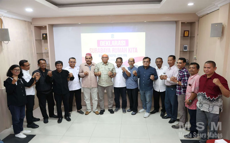 MediaSuaraMabes, Surabaya – Sebagai bentuk kepedulian dan rasa tanggung jawab, Pemerintah Kota (Pemkot) Surabaya melalui Badan Kesatuan Bangsa dan Politik (Bakesbangpol) bersama Forum Pembauran Kebangsaan (FPK) Kota Surabaya yang berkomitmen menjaga persatuan dan kesatuan antar kelompok masyarakat di Kota Surabaya dengan mewujudkan deklarasi yang bertajuk “Surabaya Rumah Kita Bersama” dimana disepakati oleh 27 suku di Surabaya, Senin (25/8/2025), di Gedung Eks Humas Pemkot Surabaya.