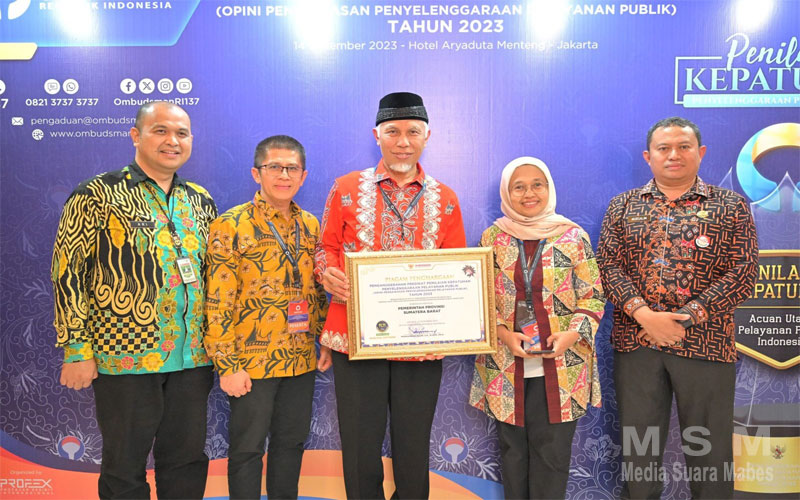 MediaSuaraMabes, Jakarta – Pemerintah Provinsi Sumatera Barat (Pemprov Sumbar), menembus jajaran enam besar provinsi dengan Penilaian Kepatuhan Penyelenggaraan Pelayanan Publik tertinggi tahun 2023. Penghargaan atas capaian tersebut diterima Gubernur Sumbar, Mahyeldi Ansharullah, dari Ombudsman RI di Aryaduta Hotel, Jakarta Pusat, Kamis (14/12/2023).