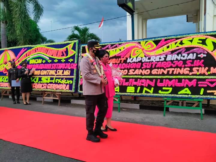 Sementara itu AKBP Romadhoni Sutardjo bersama ibu Bhayangkari turut mengiringi prosesi kedatangan Kapolres Binjai yang baru.
