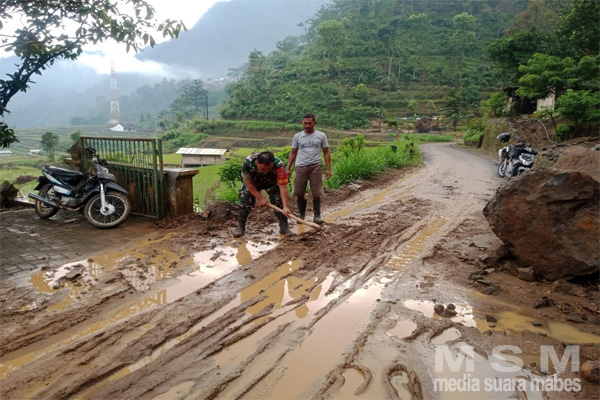 Dengan menggunakan alat seadanya Babinsa Koptu Nono Dwi Riyanto bergotong-royong bersama warga membersihkan jalan tersebut.