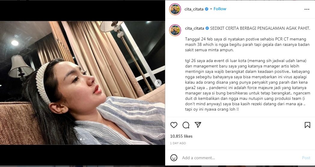 Cita Citata mengatakan bahwa dirinya tidak enak badan saat diketahui positif Covid-19, ungkapnya cerita pada akun Instagramnya.