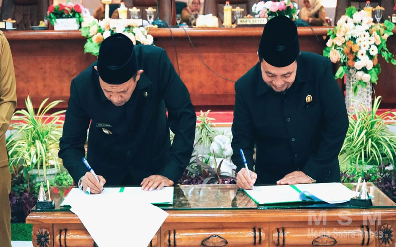 Pembacaan SK dan Berita acara DPRD Kabupaten Langkat tentang pengesahan persetujuan Ranperda APBD 2024 menjadi Peraturan Daerah Kabupaten Langkat oleh Sekretaris Dewan Drs.Basrah Pardomuan.
