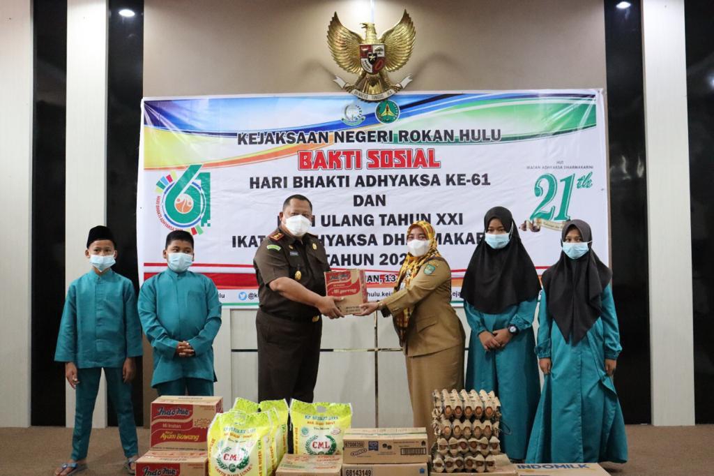 MediaSuaraMabes, RokanHulu – Kejaksaan Negeri (Kejari) Pasir Pengaraian, Kab.Rokan Hulu (Rohul) menggelar giat Bhakti sosial (Bhaksos) dengan cara berbagi dengan keluarga Pra Sejahtera ( kurang mampu) dalam rangka memperingati Hari Bhakti Adhyaksa Ke-61 dan Hari Ulang Tahun XXI Ikatan Adhyaksa Dharmakartini 2021 bertempat di Aula Baharuddin Lopa kantor Kejari Rokan Hulu. Selasa (13/07/21).