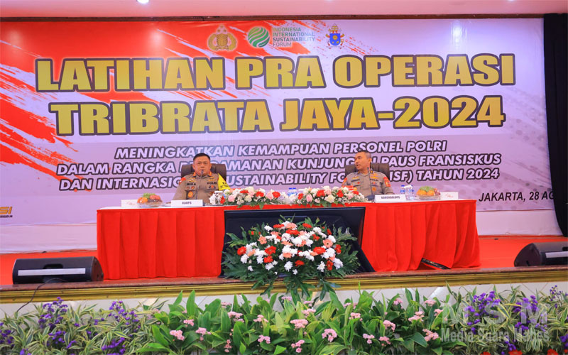MediaSuaraMabes, Jakarta – Polri menggelar latihan pra Operasi Tribrata Jaya 2024 dalam rangka pengamanan kunjungan Paus Fransiskus dan Internasional Sustainability Forum (ISF) tahun 2024. Latihan ini digelar di Balai Pertemuan Polda Metro Jaya, Rabu (28/8/2024).