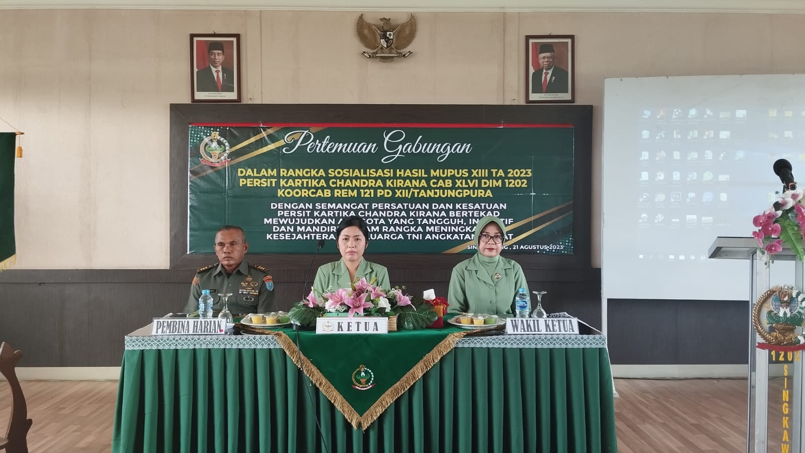 Ketua Persit KCK cab XLVI Ny . Rika Ferdy menyatakan Pertemuan gabungan dilakukan dalam rangka sosialisasi hasil musyawarah pusat Persit Kartika Chandra Kirana kepada anggota Persit KCK Cabang XLVI Kodim 1202/Skw.